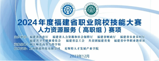 12月23日-24日,2024年度福建省职业院校技能大赛人力资源服务(高职组)赛项在闽江师范高等专科学校成功举办,来自福建省各地市的17所高职院校,30支代表队同台竞技。本次大赛由福建省教育厅主办,闽江师范高等专科学校承办,上海踏瑞科技有限公司作为技术支持单位。我校代表队获得一等奖第一名,顺利晋级国赛。参赛学生为财经商贸学院2022级人力资源管理专业学生:黄龙辉、夏兰晟、魏宇华。指导老师:邱静艺、连花。