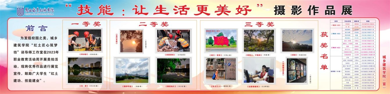通过校内拍摄、线上投稿、摄影作品评选、优秀摄影作品展览,评选出一二三等奖和优秀奖若干名,对获奖学生颁发奖金和证书,激励广大学生“红土建功、技能建业”,助力打造“予生最好学校”。训导生积极参与到活动中,进一步提高了专业技能和职业素养。