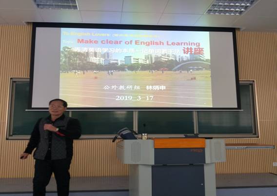 应我校英语爱好者协会的邀请,2019年3月17日下午3:00-5:00基础部公外教研室林炳申副教授给英语爱好者们开了一场《弄清英语学习的本质和记单词若干法》的讲座。通过此次讲座,让同学们明白了学英语的目的是“为用而学”、“学而能用”,不再为考试而学,不再是为了“显示语法知识有多少”而学的道理,赢得了阵阵掌声;令人耳目一新的自创单词记忆法让同学们受益颇深。