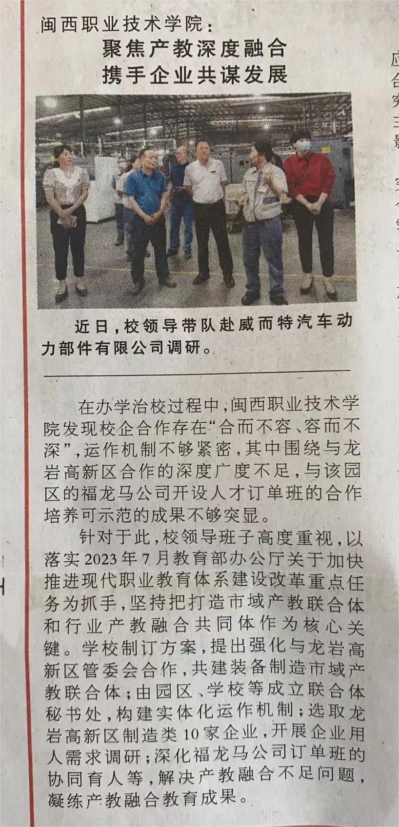 针对于此,校领导班子高度重视,以落实2023年7月教育部办公厅关于加快推进现代职业教育体系建设改革重点任务为抓手,坚持把打造市域产教联合体和行业产教融合共同体作为核心关键。学校制订方案,提出强化与龙岩高新区管委会合作,共建装备制造市域产教联合体;由园区、学校等成立联合体秘书处,构建实体化运作机制;选取龙岩高新区制造类10家企业,开展企业用人需求调研;深化福龙马公司订单班的协同育人等,解决产教融合不足问题,疑练产教融合教育成果。