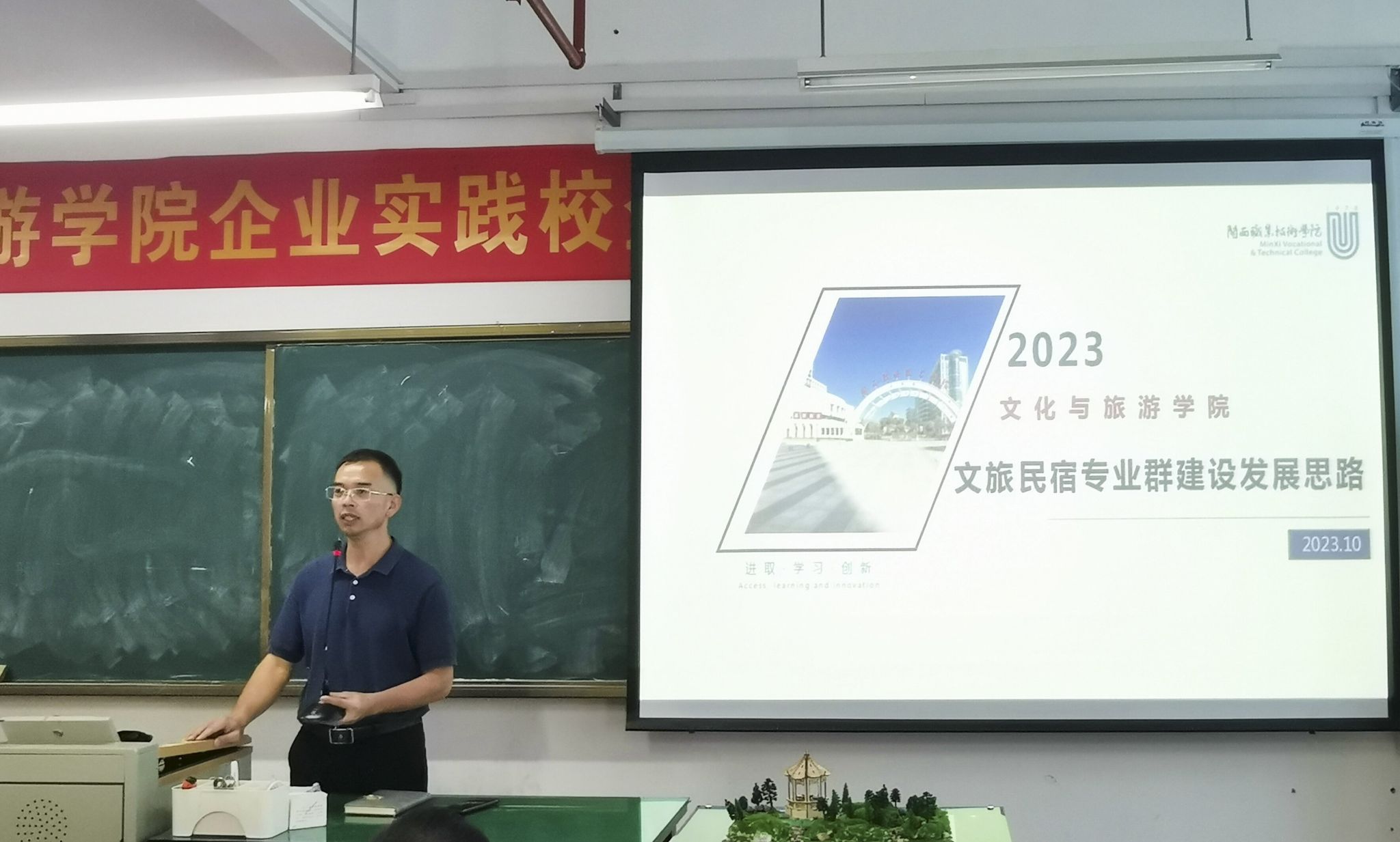 2023年10月24日,文化与旅游学院在万源楼1010室召开“文旅民宿专业群建设发展工作”全体教职工会议。学院领导及时传达了学校党政领导班子对文旅学院发展的关切和期盼,进一步明确了文化与旅游学院聚焦民宿产业的方向和未来规划,号召全体教职工凝心聚力,攻坚克难,找准专业和课程在文旅民宿专业群中的定位,加强推进模块化教学改革,全力建设高水平专业群,打造予生最好学校。