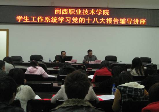 为贯彻落实学院党委关于我院学习宣传贯彻党的十八大精神的部署要求,11月26日上午,我院学生工作处邀请思想政治理论课教研部负责人林振东副教授作学习党的十八大报告专题辅导讲座。学生工作处成员、全体思政辅导员、生活辅导员、院广播站和班长阵线联盟两大学生组织干部代表共80余人参加了学习。学生工作处副处长江强明主持学习活动。