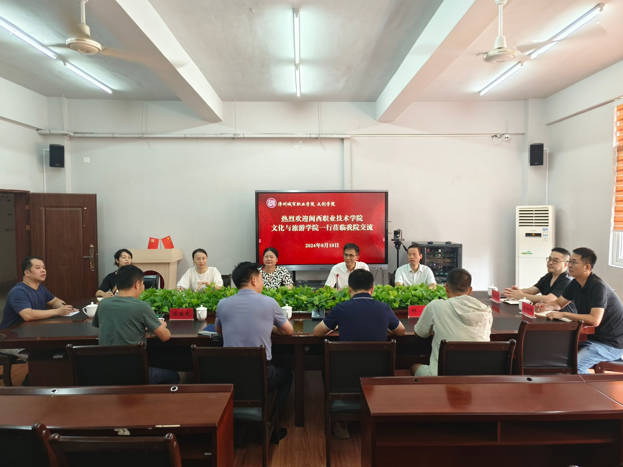 文旅学院一行受到漳州城市职业学院的热烈欢迎,副校长刘丽贞出席座谈并致欢迎辞,详细介绍了城职院的发展历程。文创学院院长王志固介绍了文创学院的发展以及专业建设情况,副书记刘蕴琼,以及各专业主任参加了座谈。文旅学院院长就城职院的热情接待表示感谢,并介绍了我校以及文旅学院的建设发展情况。