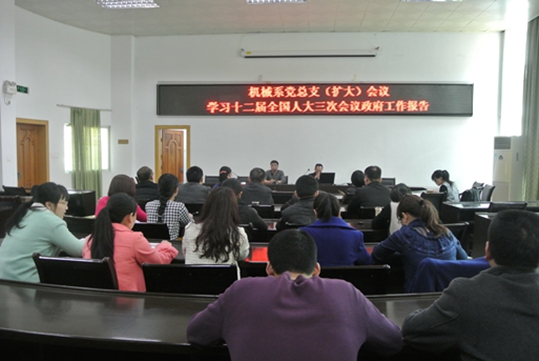 3月27日下午,机械系党总支在办公楼二楼会议室举办学习“十二届全国人大三次会议政府工作报告”。机械系党政负责人、党总支全体党员、专业主任参加学习。机械系党总支宣传委员、思想政治理论课教研部负责人林振东作专题辅导报告。