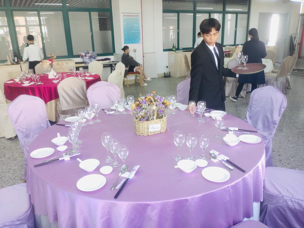 实践技能操作在万源楼714餐厅实训室中进行。1+X餐饮服务管理(中级)实践操作主要考核学生中餐摆台的技能水平和主题宴会的设计水平,口试主要考核学生对服务过程中遇到的案例进行分析的能力和专业知识的掌握水平。摆台中学生落落大方,技能操作娴熟;口试中,学生能熟练的运用专业知识回答评委的问题。