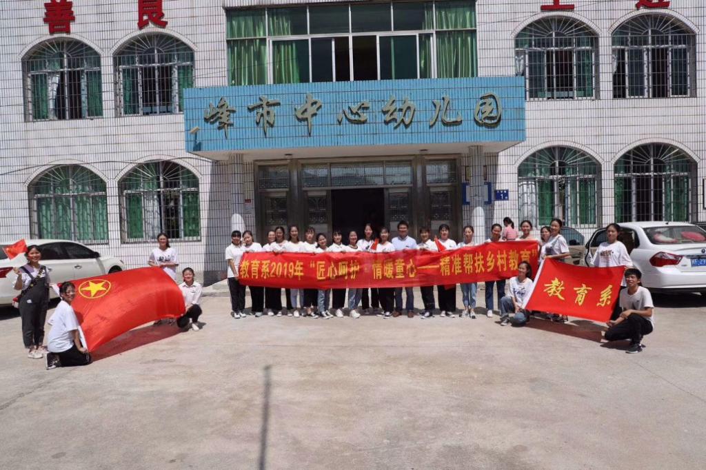 今年暑期,教育系阳光志愿服务团队在峰市中心幼儿园开展了“匠心呵护,情暖童心—精准帮扶乡村教育”关爱农民工子女的活动。为响应党中央关爱农民工子女的政策,提高社会对农民工子女等弱势群体的关注,令这些孩子能和其他同龄儿童收到公平的对待,我系策划此次活动,为她们提供志愿帮扶。