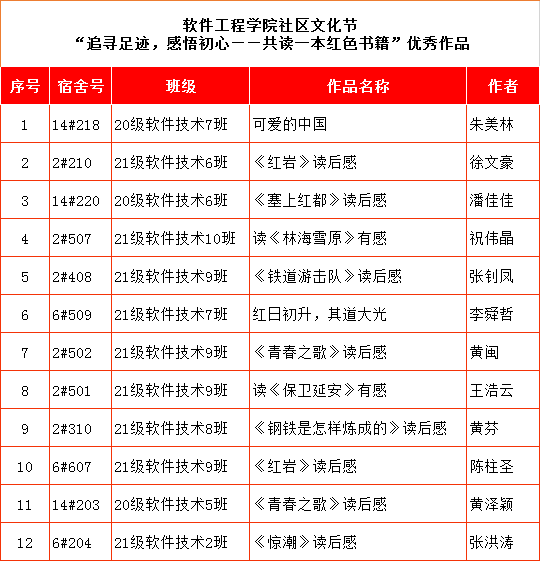 行程万里,不忘初心。为扎实开展党史教育,进一步增强青年学生学史明理、学史增信、学史崇德、学史力行的思想自觉和行动自觉,同时为了加强社区文化建设,发扬闽西“红旗不倒”精神,传承红色革命情怀,11月8日~11月30日,软件工程学院以宿舍为单位,开展“追寻足迹,感悟初心—共读一本红色书籍”活动。同学们以宿舍为单位认真组织,共同学习,并撰写读后感。