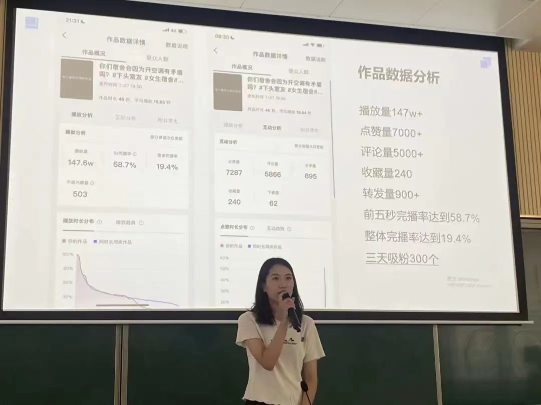 汇报会上,小组或个人通过详实的数据、清晰的图表、丰富的案例,展示了新媒体运营方向的同学们在抖音运营、小红书运营、淘宝运营、微信公众号运营、网站运营等方面的实训成果,是对整个实训过程的总结与概括,也体现了软件工程学院项目导向教学所取得的良好效果。