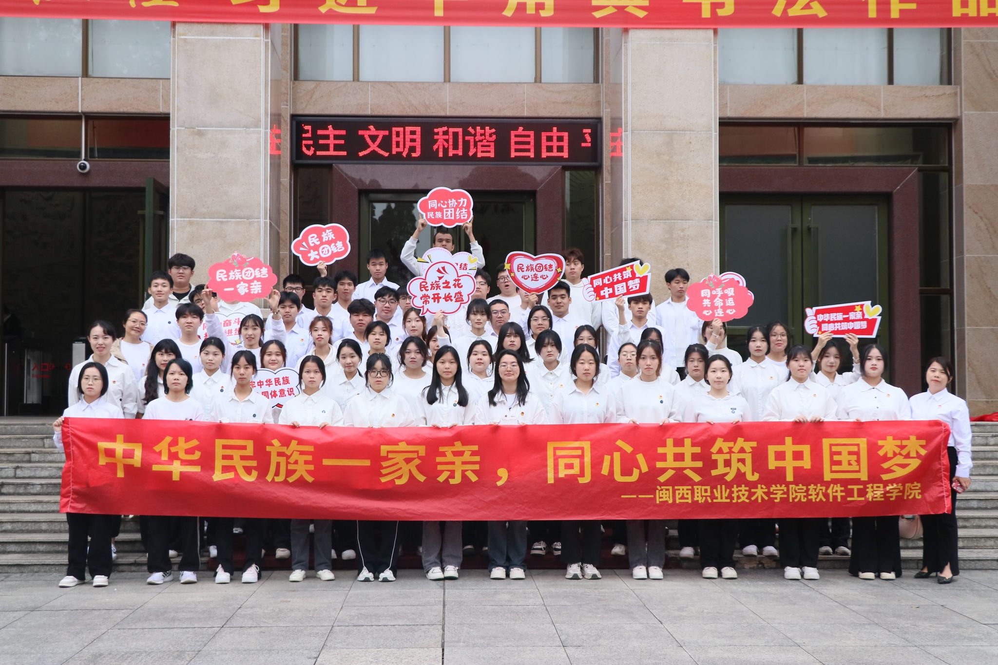2024年3月12日~3月25日,royal皇家88平台软件工程学院开展以“中华民族一家亲,同心共筑中国梦”为主题的铸牢中华民族共同体意识主题月宣传活动。通过召开主题班会、组织各民族学生前往闽西烈士陵园祭扫及参观中央苏区(闽西)历史博物馆、发放宣传资料等方式,有形有感有效地推动铸牢中华民族共同体意识深入人心。各班级开展主题班会共18场,各民族师生共68人参加了闽西烈士陵园祭扫及中央苏区(闽西)历史博物馆参观,各民族学生共86人发放宣传资料412份。