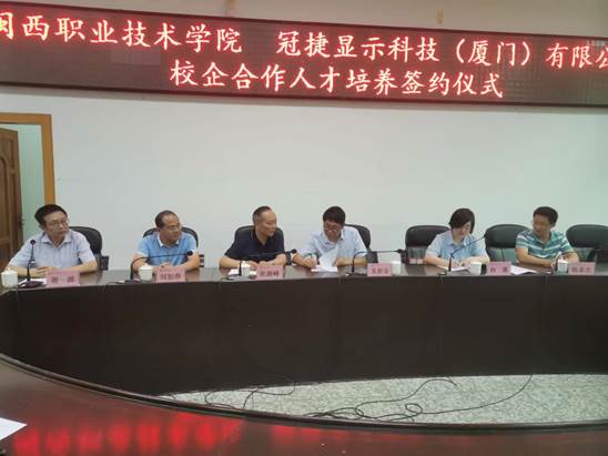 2022年6月16日,我校与冠捷显示科技(厦门)有限公司在协成楼二楼会议室举行校企合作签约仪式,参加人员有吴新业副校长,教务处张源峰处长,信息与制造学院党政班子成员及相关专业师生,冠捷公司人事部杨璐经理等。我校信息与制造学院将与冠捷显示科技在人才培养、教师挂职锻炼等方面展开校企深度合作,这将推动该院的产教融合工作,提高人才培养质量。
