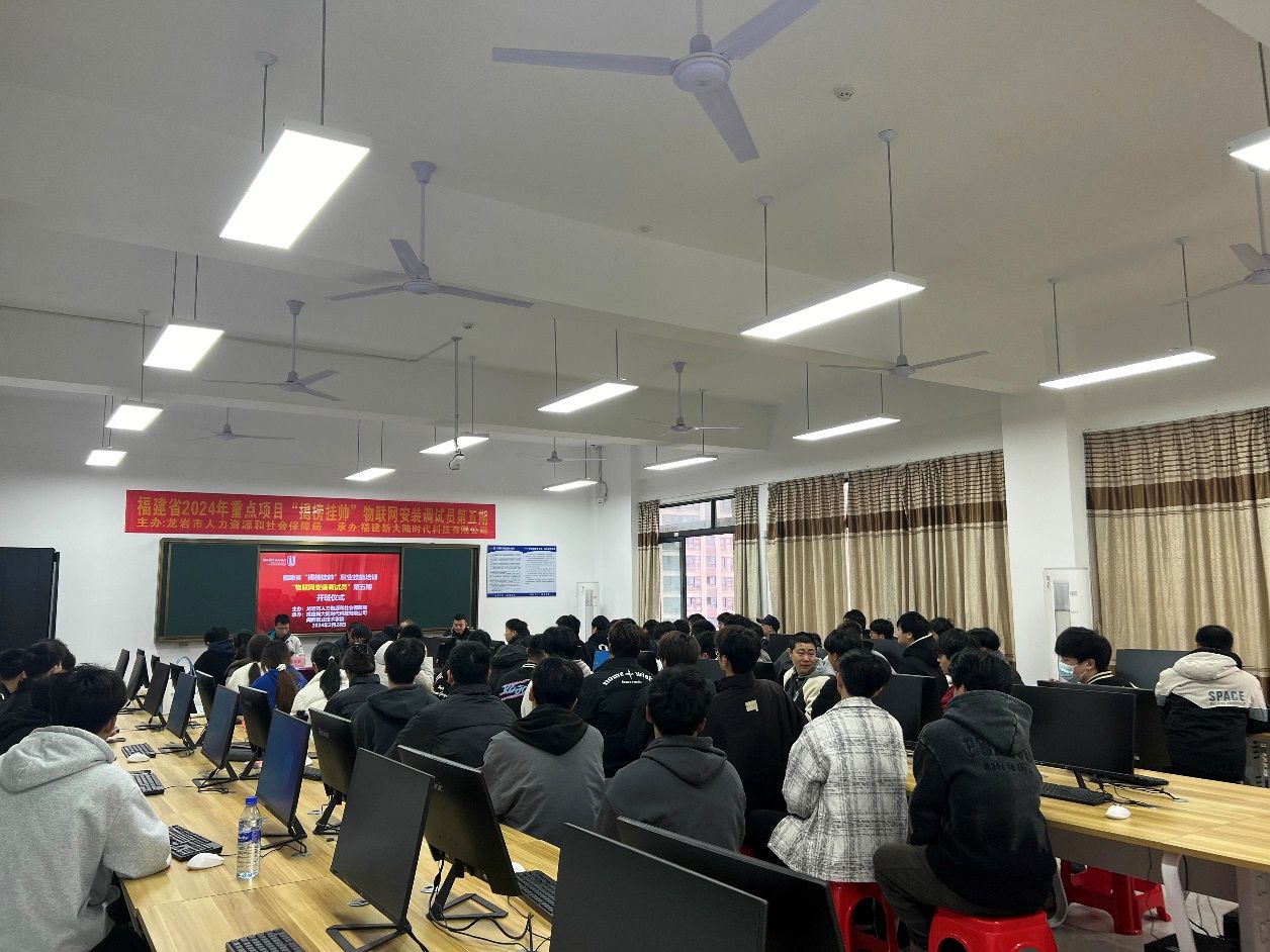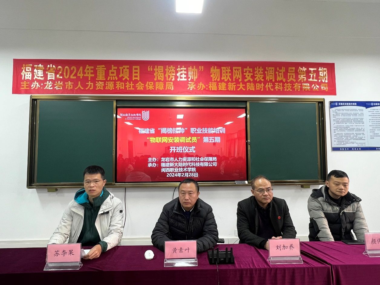 为进一步提升物联网技术技能人才的职业知识、职业技能及综合素质,2月28日,由龙岩市人力资源和社会保障局主办,福建新大陆时代科技有限公司和royal皇家88平台承办的“揭榜挂帅”物联网安装调试员职业技能培训在辛耕楼507举办了开班仪式,信息工程学院领导班子、相关老师及60余名学生参加此次活动。