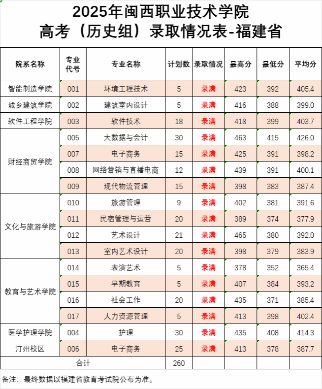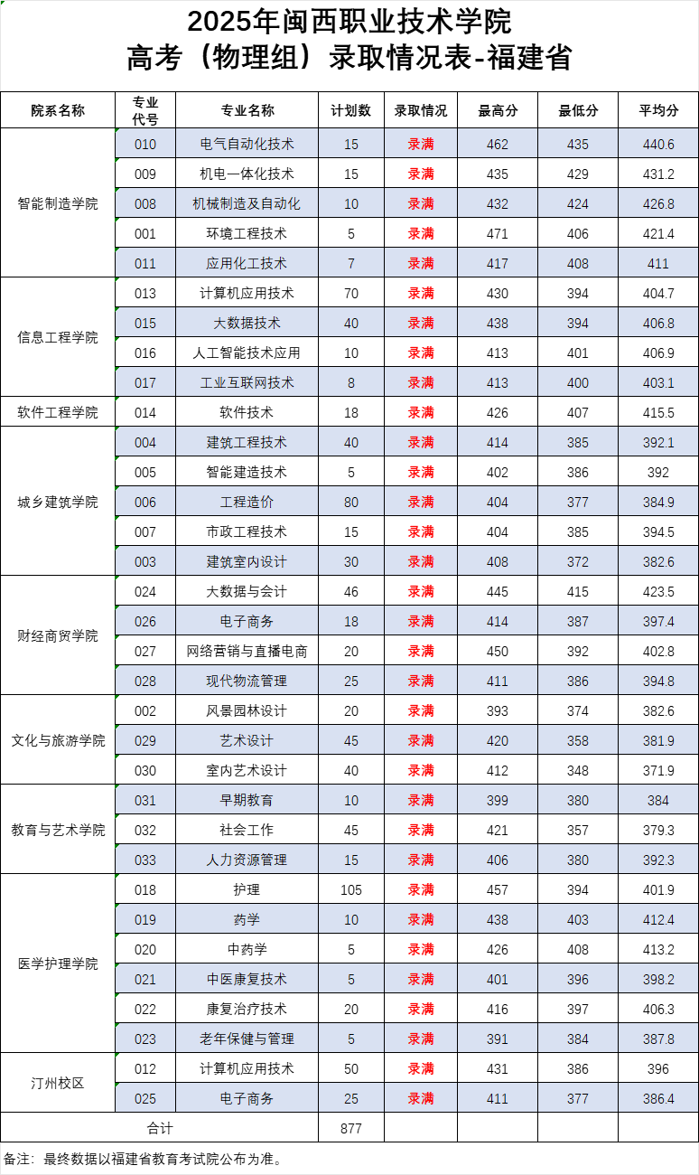 2025年我校福建省高考招生计划一次性录满,其中物理组普通类投档分最高分471(超本科线30分),最低分348,平均分397.37。历史组普通类投档分最高分465(超本科线15分),最低分352,平均分397.2。